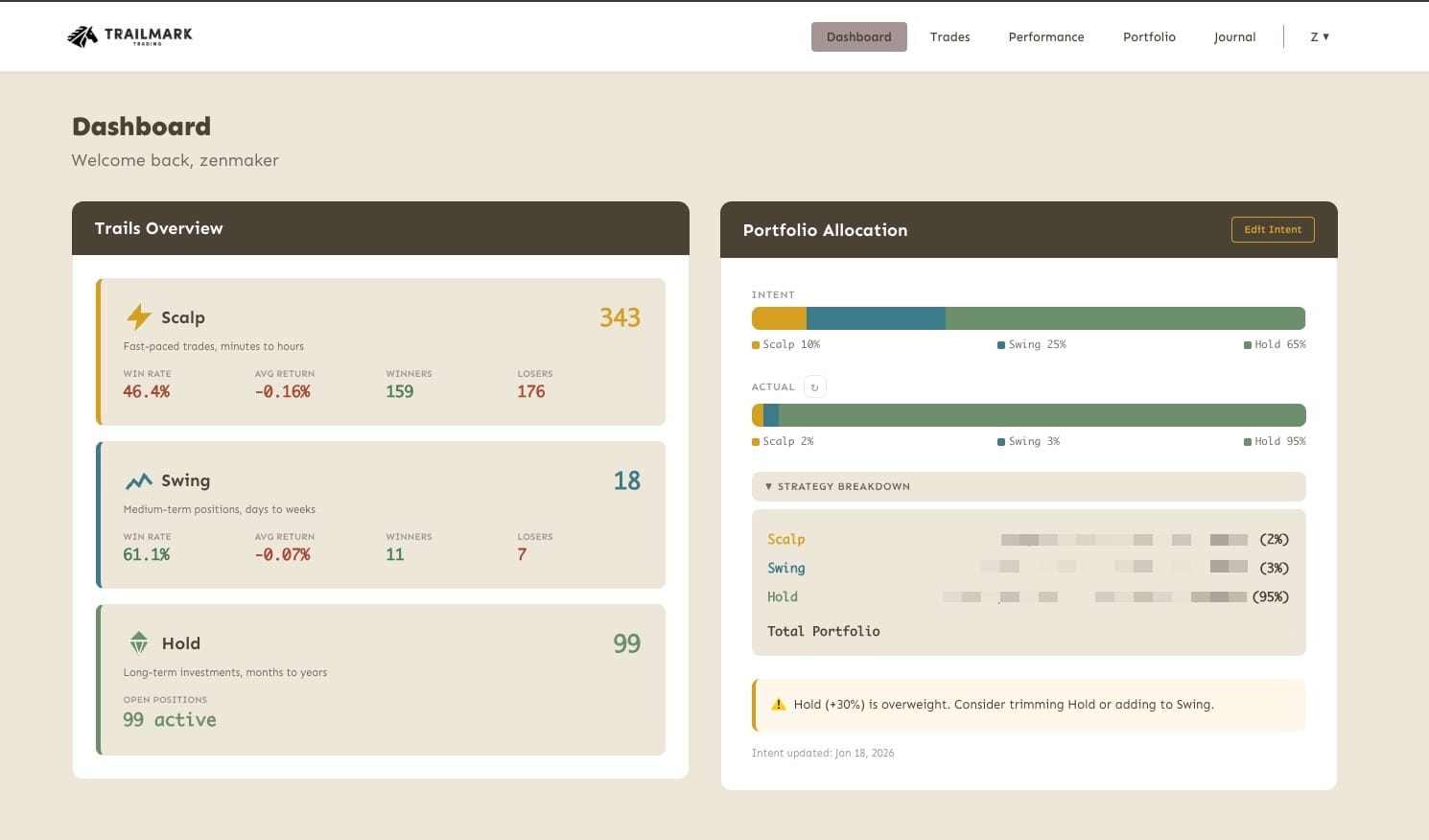 Trailmark is a trading journal and portfolio analytics platform for individual investors who run multiple strategies simultaneously. The core insight is that most traders don't just do one thing — they scalp, they swing-trade, and they hold long-term positions — but every tool on the market forces you to lump them together. Trailmark separates Scalp, Swing, and Hold into first-class strategy lanes, each with their own trade views, journal system, and performance metrics.It's a single-user product today (the founder's own tool), but built with multi-tenancy via Supabase RLS from day one.